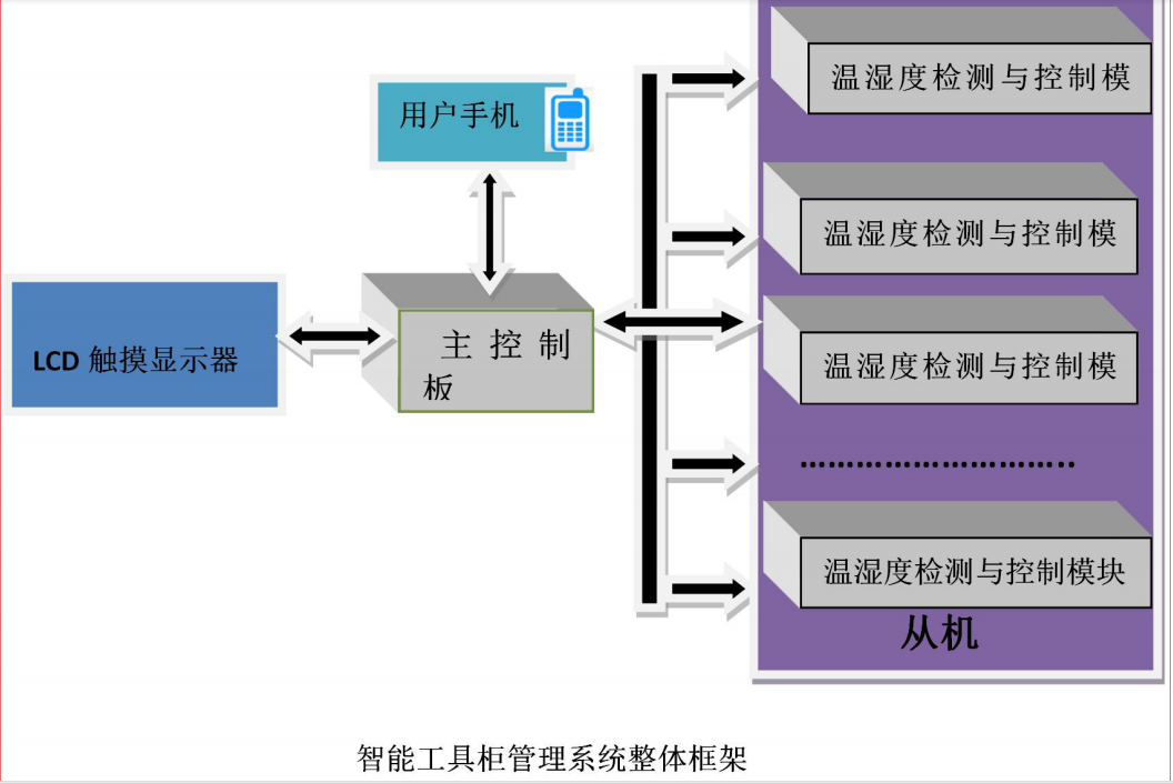 智能工具柜管理系統由 LCD 觸摸顯示屏、主控制板,多個從機模塊(溫濕度采集控制及工具位置信號采集)組成,具有以下功能特點:
