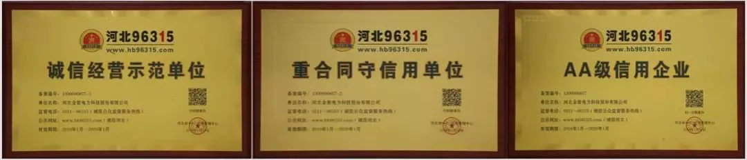 金能電力榮獲河北96315“誠信經(jīng)營示范單位”、“重合同守信用單位”、“AA級(jí)信用企業(yè)”
