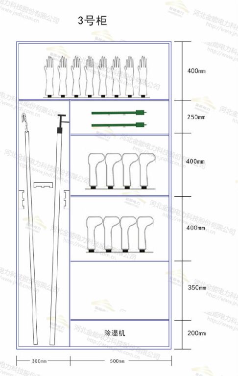 如上圖規格為2000*800mm,左側高2000mm,寬200mm存放接地線,右半部分寬600mm,分為4層,其中頂部250mm存放驗電器,下面450mm存放絕緣手套,下面400mm存放絕緣靴,下面700mm可存放令克棒等安全工器具,底部200mm為除濕機。