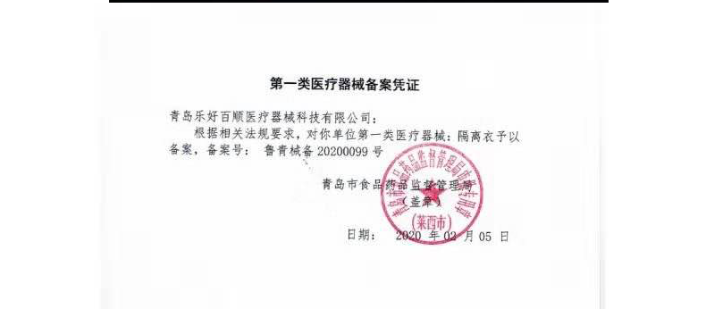 防護服由連帽上衣、褲子組成,分為連身式結構和分身式結構。防護服的結合部位應嚴密。袖口、腳踝口采用彈性收口,帽子面部收口及腰部采用彈性收口、拉繩收口或搭扣。產品性能:防護服透濕量應不小于2500g/(m2?d),防護服對非油性顆粒物的過濾效率不小于70%,防護服帶電量應不大于0.6μC。其它性能指標詳見注冊產品標準《一次性醫用防護服》。