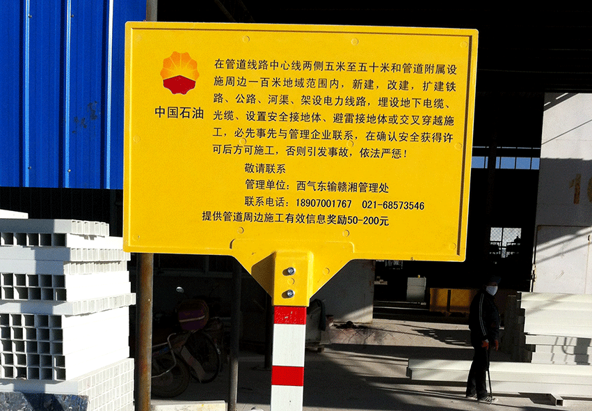 上圖為金能電力設(shè)備有限公司專門為中國石油天然氣股份有限公司西氣東輸工程制作的復(fù)合材料標志牌。